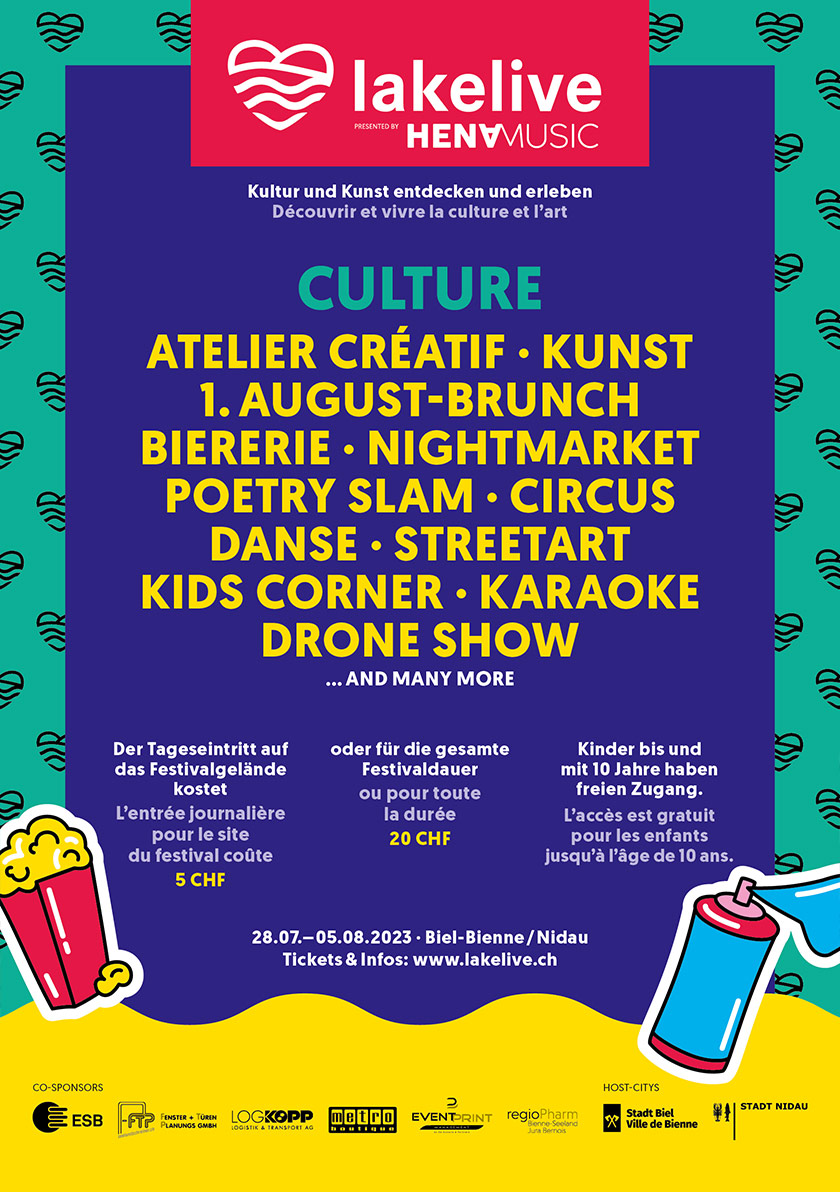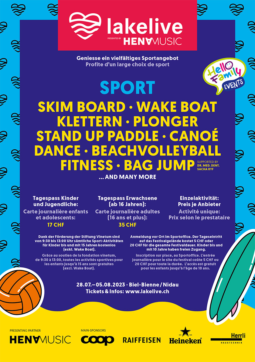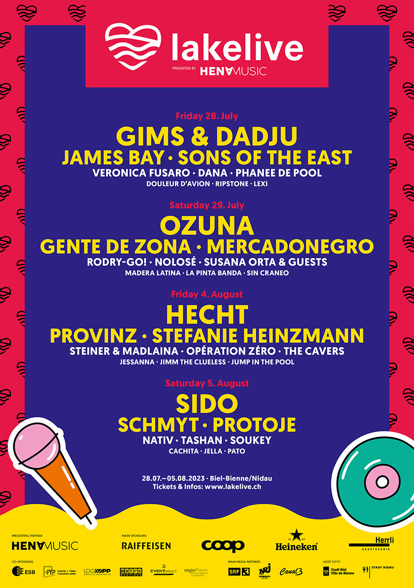 Erlebe einzigartige Momente mit HENA Music am Lakelive Festival 2023 in Biel/Bienne. Neun Tage Musik, Spass, Sports, Kultur und Entertainment vom Feinsten auf der legendären Expo-Beach. Bühne frei für Gims & Dadju, Ozuna, Hecht, Sido und viele weitere Top Acts. Be with us!